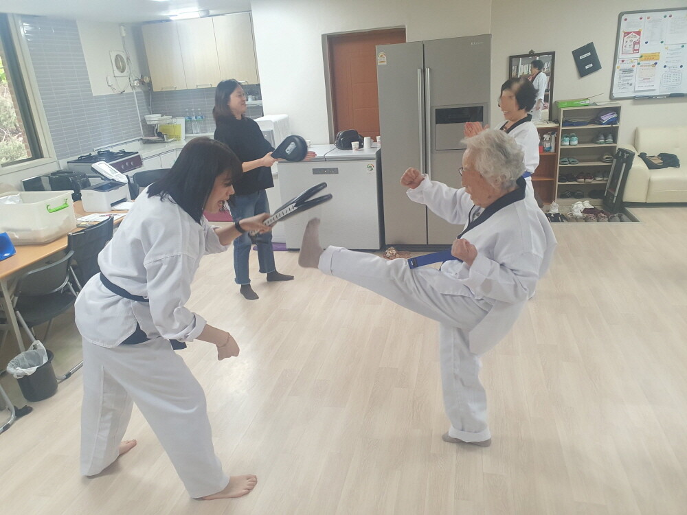 [사진설명] 은빛 태권도 프로그램 중 발차기를 하고 있다.
