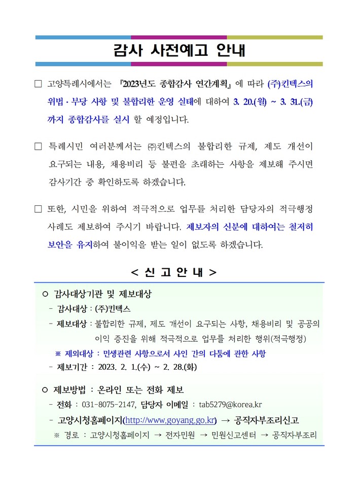한편 고양시는 제보사항에 대하여 감사기간 중 사실 여부를 확인하여 잘못된 사항에 대하여는 시정 등의 조치를 하며, 감사결과를 고양시청 홈페이지에 공개할 예정이다.