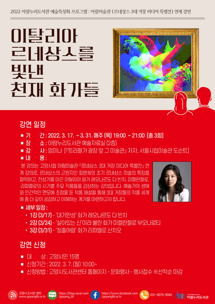 [부자동네타임즈 김인수기자] 고양시 아람누리도서관이 오는 3월 17일부터 매주 목요일 오후 7시 총 3회에 걸쳐 강연 이탈리아 르네상스를 빛낸 천재 화가들을 운영한다.