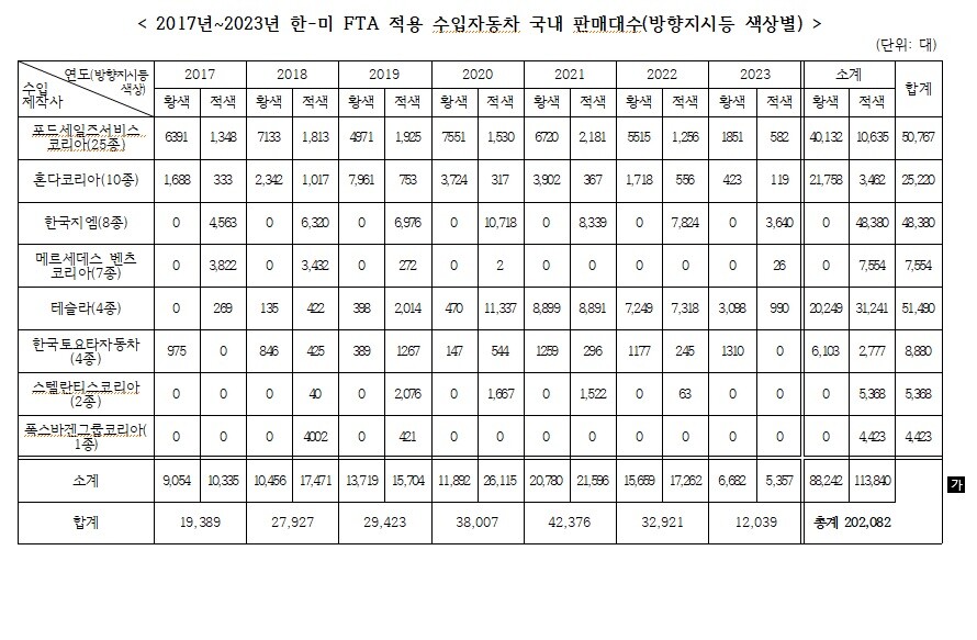- 정부, 매년 ‘한-미 FTA 자동차작업반 회의’서 “적색 제외” 요구 중이나 수용 안 돼.