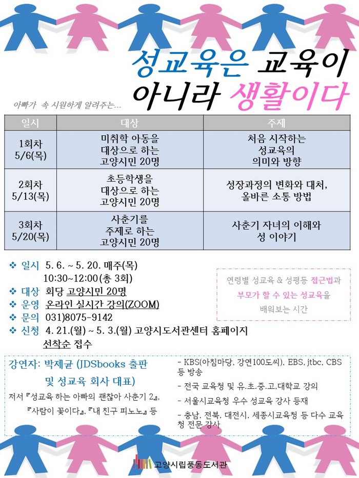 프로그램은 1회(5월6일) 미취학 아동을 대상으로 하는 고양시민 20명, 2회(5월13일) 초등학생을 대상으로 하는 고양시민 20명, 3회(5월20일) 사춘기를 주제로 하는 고양시민 20명을 대상으로 진행한다.