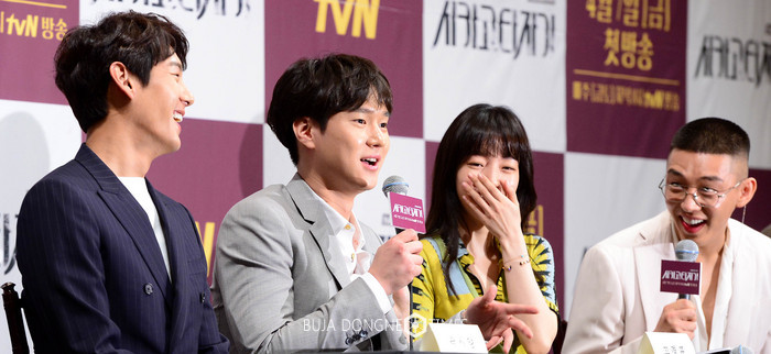 5일 오후 서울 강남구 임피리얼 팰리스에서 열린 tvN '시카고 타자기' 제작발표회에서 곽시양(왼쪽부터), 고경표, 임수정, 유아인이 취재진의 질문에 답하며 웃고 있다. 2017.04.05.