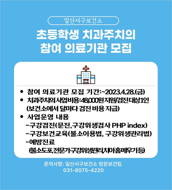 [부자동네타임즈 김인수기자] 고양특례시 일산서구보건소가 ‘경기도 초등학생 치과주치의 사업’에 참여할 치과 병·의원을 4월 28일까지 모집한다.