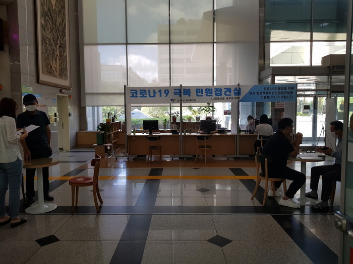 일산동구청 1층 로비의 휴게공간을 활용해, 민원처리에 장애를 주지 않고 안전하게 업무처리가 가능하도록 pc, 전화기, 가림막 등을 설치했다. 방문민원인은 발열체크와 출입명부 등록을 완료 후, 1층 민원접견실에서 민원상담 및 업무처리를 진행하게 된다.