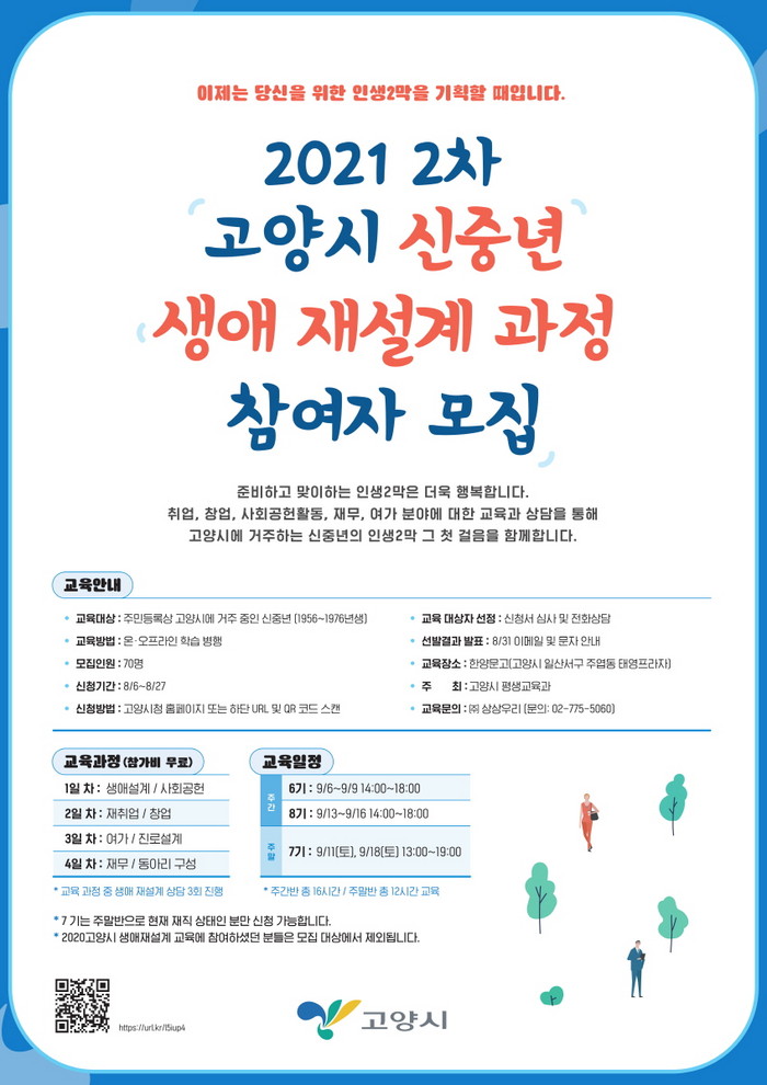 [부자동네타임즈 김인수기자] 고양시는 오는 8월 6일부터 27일까지 신중년 세대들의 행복한 인생2막을 지원하기 위한 ‘5060 신중년 생애 재설계 과정’제2차 참여자를 모집한다.
