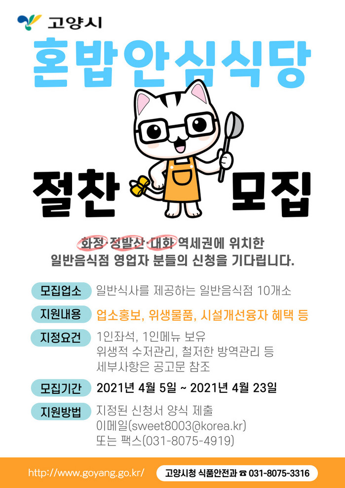 ‘혼밥안심식당 시범사업’은 1인 가구 증가와 코로나19로 인한 혼밥 문화가 확산됨에 따라 실시한다. 혼밥안심식당으로 지정되는 업소는 지정 스티커 부착과 함께 고양시청 홈페이지등을 통한 홍보, 위생물품 및 시설개선융자 등의 혜택을 지원받게 된다.