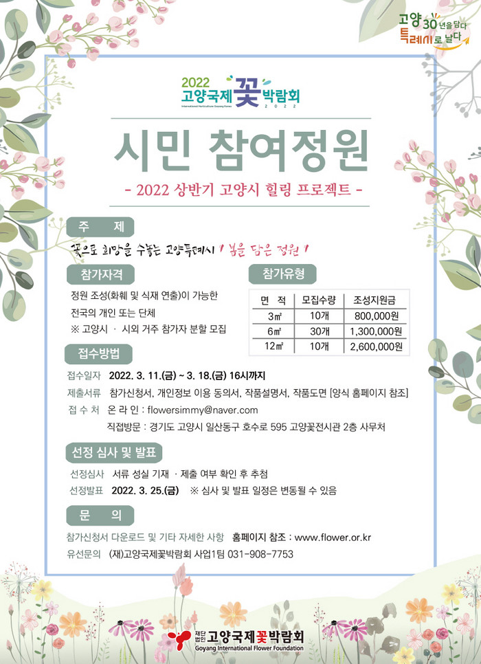 박동길 고양국제꽃박람회 대표이사는 “고양특례시 출범과 더불어 새로운 봄을 알리는 정원이 시민들의 손에서 어떻게 탄생될 지 기대된다. 시민 여러분들의 많은 관심과 참여 부탁드린다.”고 말했다.