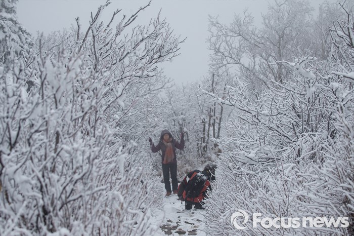 (평창=포커스뉴스) 강원도 8개 시군 산간 지역에 대설주의보가 내려진 24일 오후 강원도 평창군 발왕산 정상에 눈이 쌓여 설경이 장관을 이루고 있다.