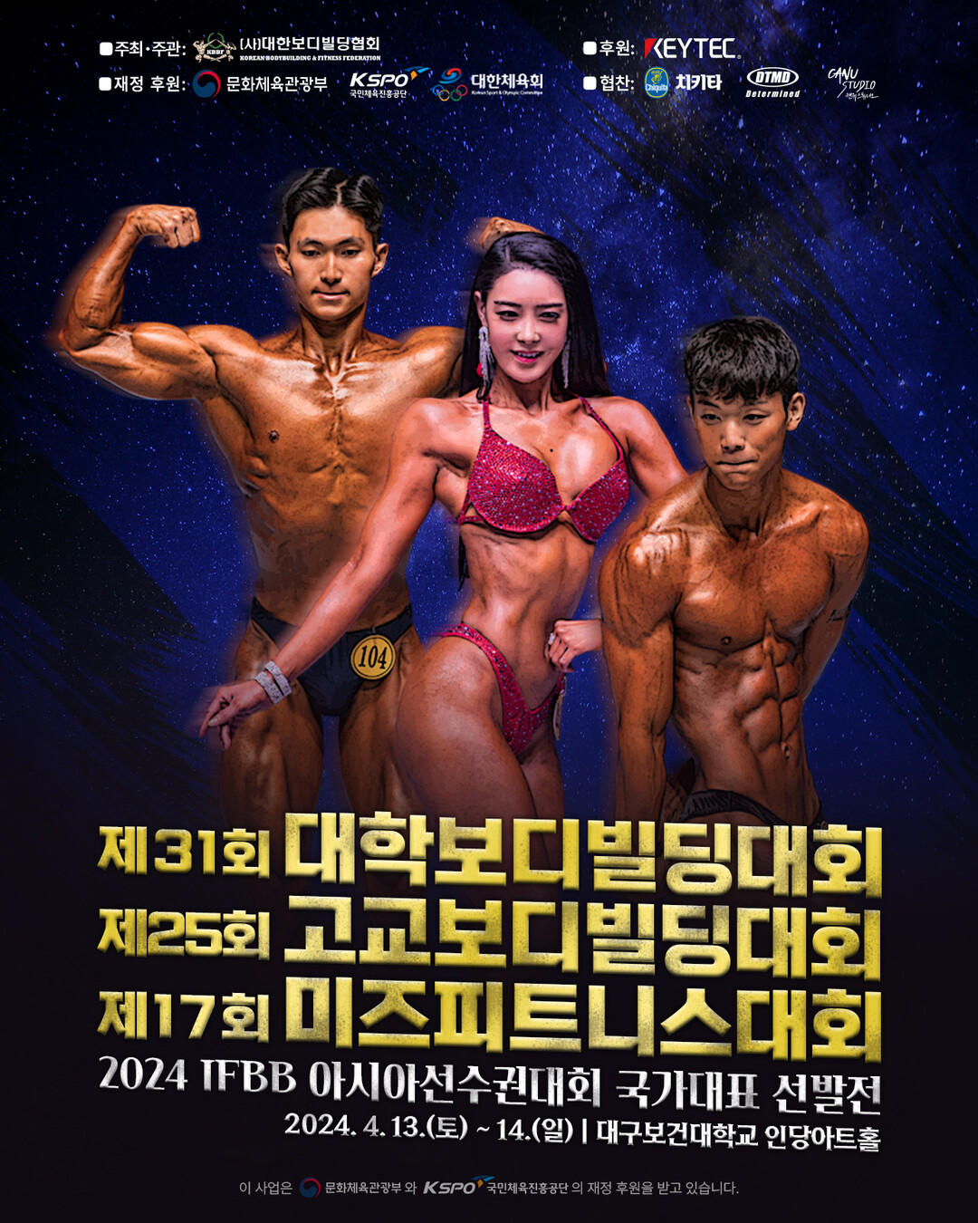 오는 4월 13일~14일 대구보건대학교 인당아트홀에서 진행되며, 18세 이하 선수들과 여자 선수들이 참가한다. 특히 이번 대회는 오는 6월, 몽골 울란바토르에서 열리는 2024 IFBB 아시아선수권대회에 참가하기 위한 국가대표 선발전을 동시 개최하며, 전국에서 내로라하는 선수들이 다수 출전한다.
