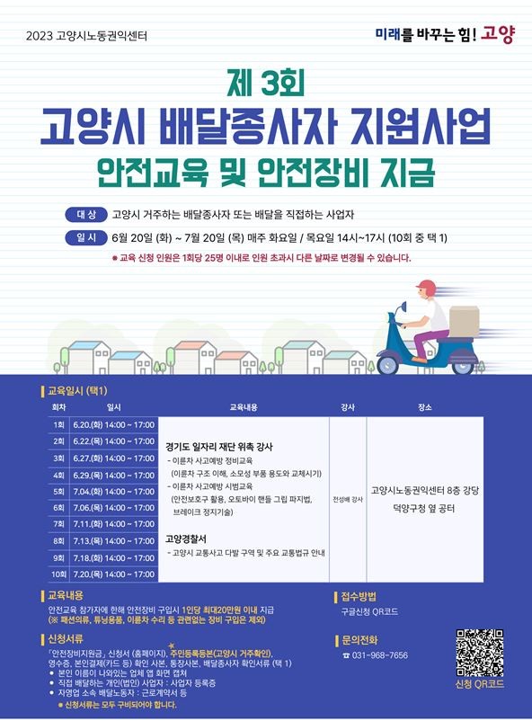 고양시노동권익센터는 고양시노동권익센터 및 덕양구청에서 10회에 걸쳐 안전교육을 운영한다. 배달종사자는 원하는 날짜에 교육을 신청하여 이수하면 된다.