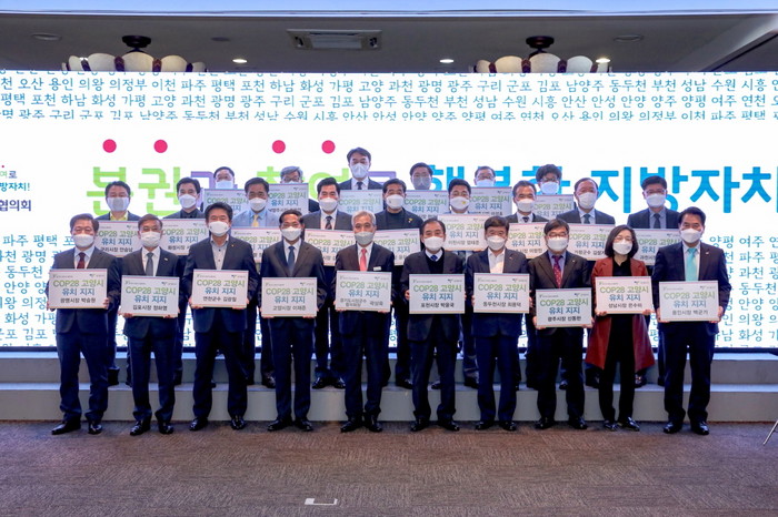 [사진설명] 4월 28일 고양시의 ‘제28차 유엔기후변화협약 당사국총회(COP28)’ 유치를 위해 경기도시장군수협의회가 킨텍스에서 이를 촉구하는 성명서를 발표하고 있다.