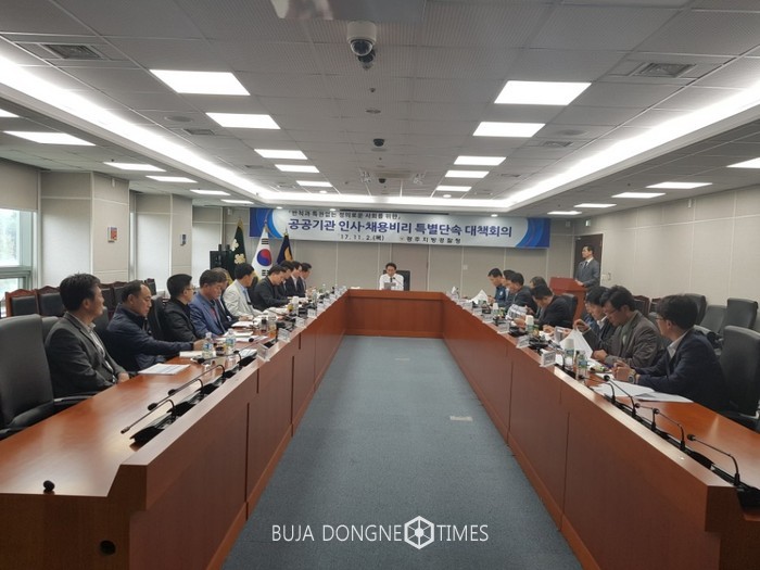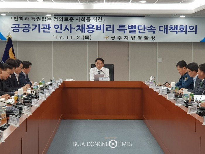 광주지방경찰청(청장 배용주)은 '17년 11월 2일(목) 14:00경 광주경찰청 무등홀에서 청장, 2부장, 수사 · 정보 · 보안 · 형사과장, 경찰서 수사과장 등 총 21명이 한자리에 모여 국민의 공분을 사고 있는「공공기관 인사 · 채용비리」특별단속을 위한 대책회의를 가졌다.