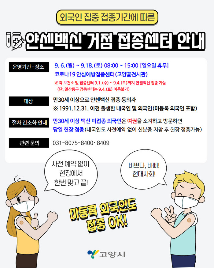 한편, 사전 예약한 외국인의 경우 각 보건소 및 접종센터에서 9월 1일(수)부터 9월 4일(토)까지 얀센 백신 접종을 진행 중이다.