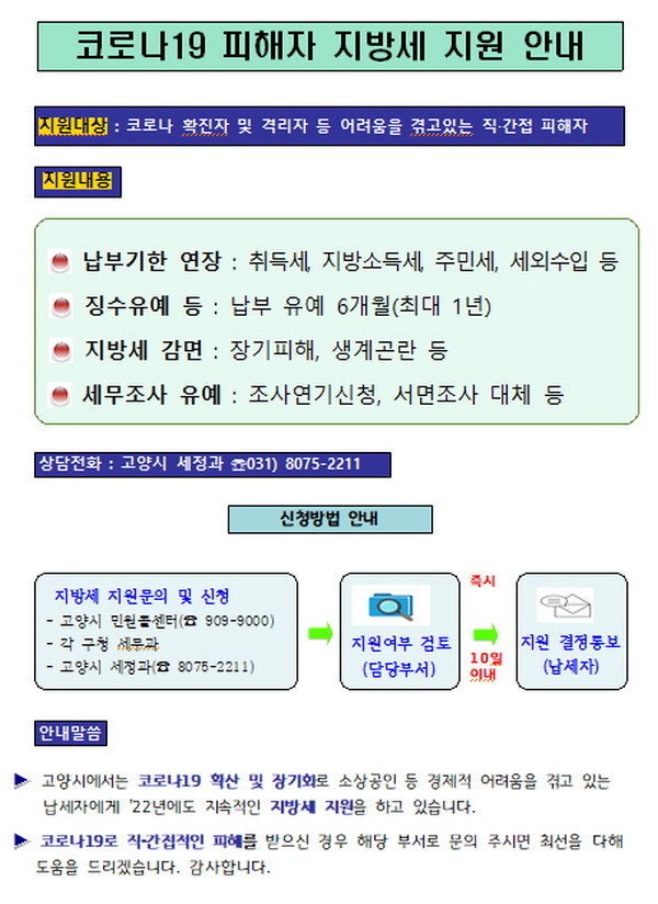 지방세 지원 상담을 원하는 시민은 고양시 세정과, 민원콜센터 또는 각 구청 세무과를 통해 상담을 요청하면 된다.