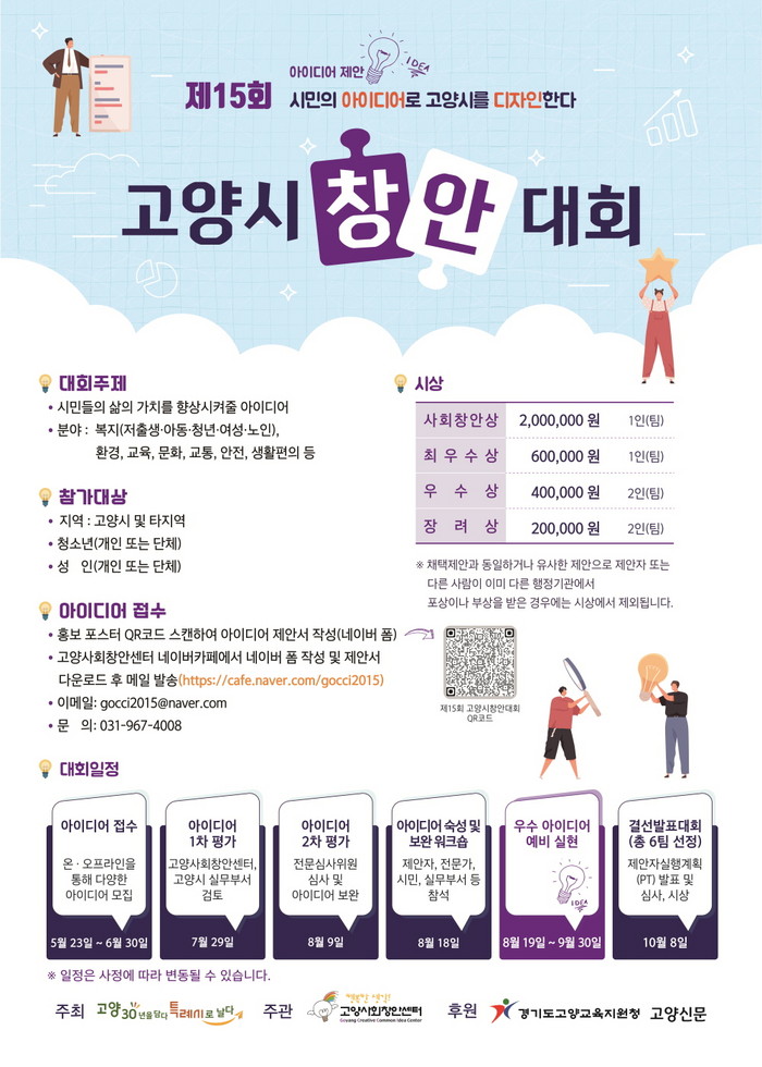 대회 주제는‘시민의 삶의 가치를 향상시켜줄 아이디어’이다. 시는 복지(저출생·아동·청년·여성·노인), 환경, 교육, 문화, 교통, 안전, 생활편의 등 모든 분야에 대한 아이디어를 접수한다. 고양시민은 물론 타지역 시민도 대회에 응모할 수 있다.