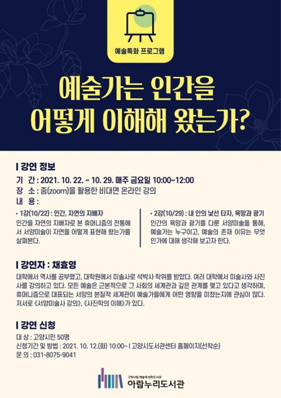 [부자동네타임즈 김인수기자] 고양시 아람누리도서관이 예술특화프로그램 예술가는 인간을 어떻게 이해해 왔는가?을 온라인 운영한다. 이 강연에서는 서양미술사를 ‘휴머니즘’이라는 키워드를 통해 생각해본다.
