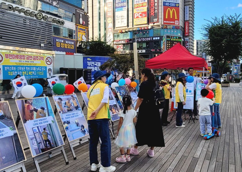 | ▲ 지난 21일 부천역 광장에서 신천지자원봉사단 부천지부 자원봉사자가 시민들에게 집수리 봉사활동을 알리는 캠페인을 부천역 마루광장에서 진행하고 있다. [사진 제공 = 신천지자원봉사단 부천지부] |