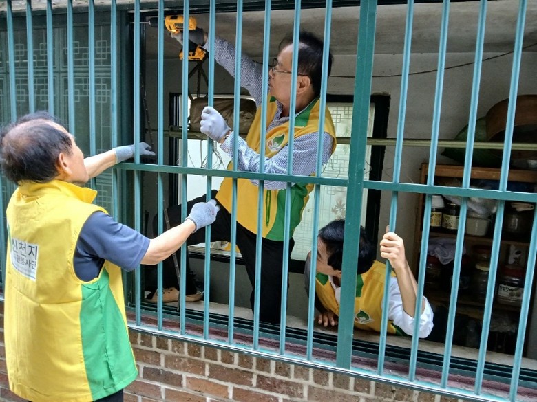 | ▲ 지난 4월 신천지자원봉사단 봉사자들이 장애어르신 집에서 방충망 교체를 진행했다. [사진 제공 = 신천지자원봉사단 부천지부] |