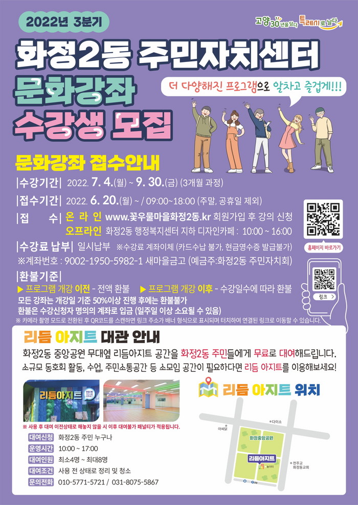 [부자동네타임즈 김인수기자] 고양시 화정2동행정복지센터(동장 김현정)는 코로나19로 중단됐던 주민자치센터 운영을 재개하면서, 화정2동 주민자치회(회장 최진홍)가 7월 4일부터 9월 30일까지 진행하는 2022년 3/4분기 문화강좌 수강생 모집한다고 전했다.