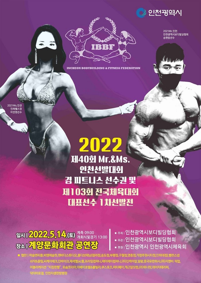 [부자동네타임즈 김인수기자] 인천광역시보디빌딩협회가 오는 5월 14일 "2022 제 40회 미스터인천&미즈인천 선발대회 겸 피트니스 선수권 및 제103회 전국체육대회 대표선수 1차 선발전"이 계양문화회관 공연장에서 개최한다고 밝혔다.