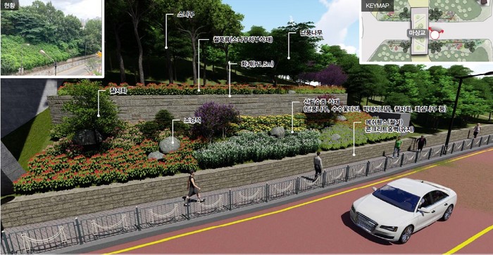 우선 공원 법면에 자라고 있는 칡넝쿨과 아카시나무를 제거하고 화계(보강토 옹벽)와 조경석을 쌓아 식재 기반을 조성한 후, 소나무와 단풍나무 등 수목을 식재해 계절감을 느낄 수 있도록 경관을 개선한다. 특히, 공원의 주 진입부인 마상 배드민턴장 사면에는 출입구 성격을 살려 공원간판도 설치할 계획이다.