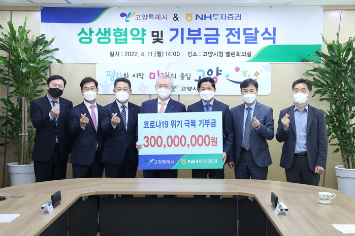 [부자동네타임즈 김인수기자] 고양시는 4월 11일 ㈜NH투자증권으로부터 코로나19 취약계층 및 손실업종 지원을 위해 3억원을 기부 받았다고 전했다.