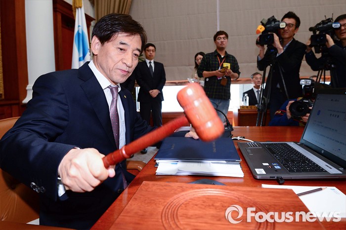 | △ 지난 15일 오전 서울 중구 남대문로 한국은행에서 이주열 한국은행 총재가 금융통화위원회에 참석해 의사봉을 두드리고 있다. <사진제공=포커스뉴스> |