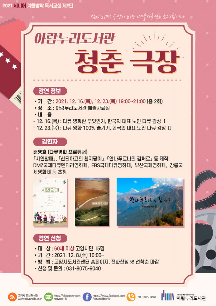 [부자동네타임즈 김인수기자] 고양시 아람누리도서관이 배영호 PD를 초청해 노인 대상 문화 프로그램 도서관 속 청춘 극장을 개최한다.