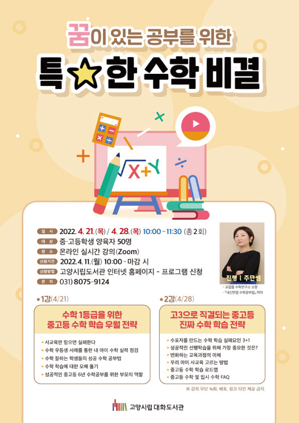 [부자동네타임즈 김인수기자] 고양시 대화도서관이 오는 4월 21일 목요일 오전 10시부터 학부모 대상 진로독서 프로그램 꿈이 있는 공부를 위한 특별한 수학 비결을 온라인으로 운영한다.
