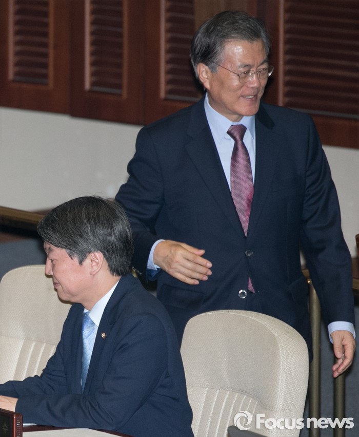 | △ 문재인(오른쪽) 새정치민주연합 대표가 지난 12일 오후 서울 여의도 국회 본회의장에서 안철수 의원 옆을 지나고 있다. <사진제공=포커스뉴스> |