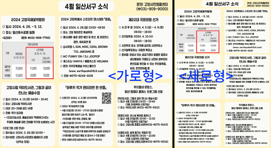 구 관계자는 “2022년 10월부터 제작해온 일산서구 소식을 올해부터는 각 부서에서 실정에 맞게 적극 활용할 수 있도록 가로형 및 세로형 2가지 버전으로 제작하기 시작했다. 각 부서를 방문하는 민원인들이 이달의 유용한 정보를 놓치지 않도록 열심히 노력하겠다.”라고 전했다.