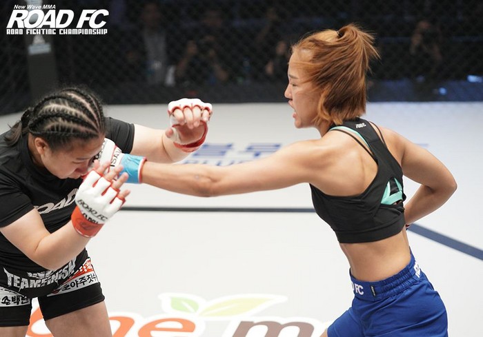 가장 먼저 제 2경기에 출전한 박지수가 데뷔전에서 ROAD FC 여성 파이터 최단 시간 승리 기록을 경신했다.