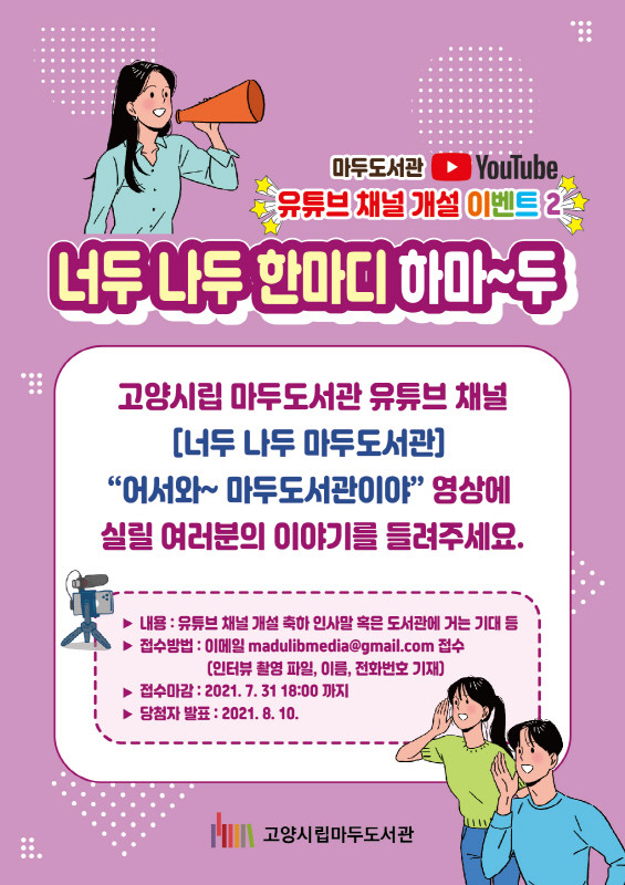 이에 마두도서관은 유튜브 채널 개설을 앞두고 이벤트를 진행 중이다. 먼저 마두도서관 유튜브 채널이름을 맞추는 ‘채널명을 맞춰라!’와 마두도서관 유튜브 채널 개설을 축하하는 시민의 이야기를 담은 ‘너두 나두 한마디 하마~두’를 통해 마두도서관 이용과 관련한 시민의 이야기를 전할 예정이다.