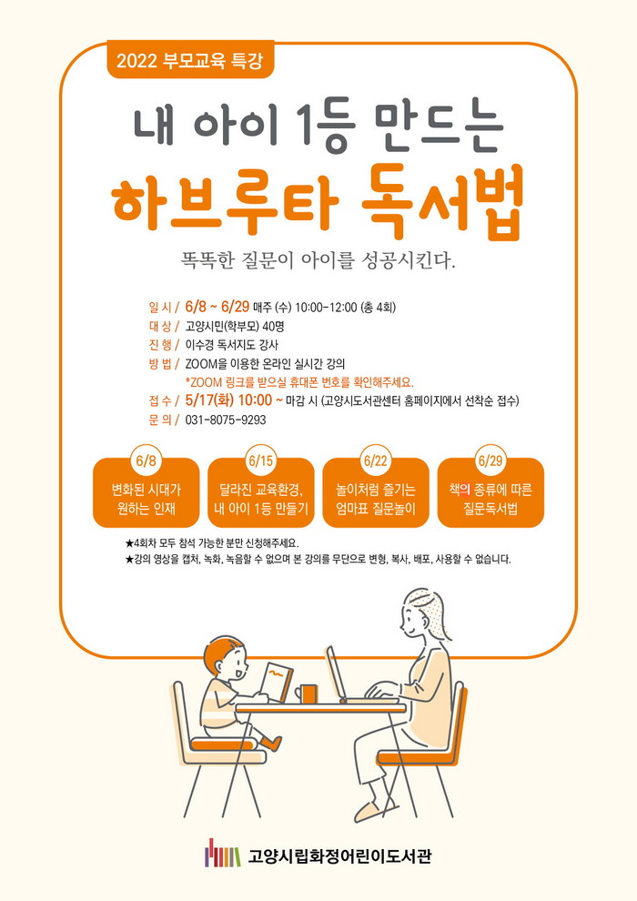 [부자동네타임즈 김인수기자] 고양시 화정어린이도서관이 2022 부모교육 특강으로 자녀에게 올바른 독서교육을 가르칠 수 있도록 돕는 내 아이 1등 만드는 하브루타 독서법을 운영한다.