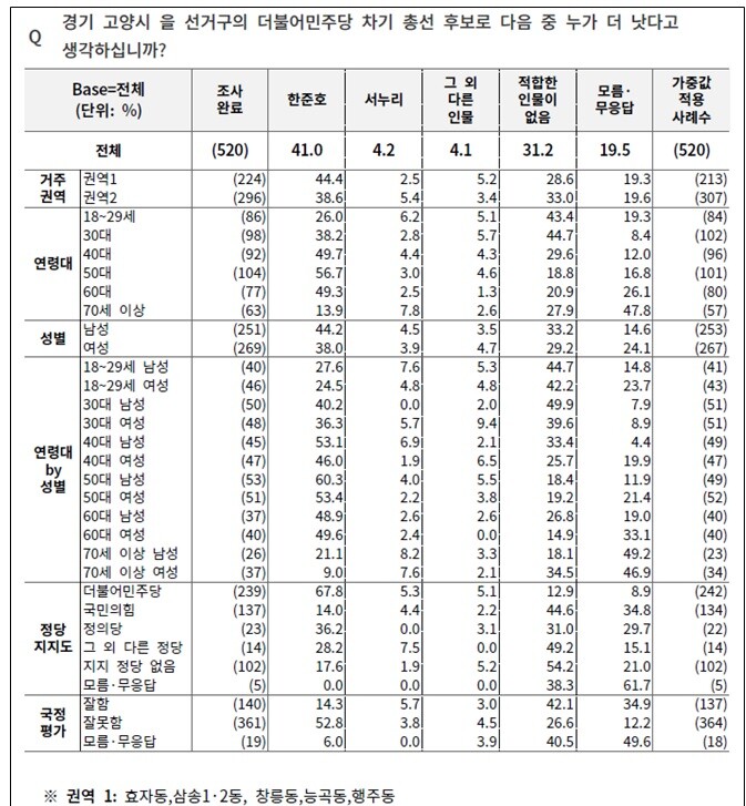 지난 15일 유튜브 김어준의 겸손은 힘들다 뉴스공장에서 생방송으로 발표한 ‘경기 고양시을 국회의원선거 여론조사’ 결과에 따르면, 오는 제22대 국회의원선거에서 고양시(을) 지역구의 더불어민주당 후보로 가장 적합한 인물로 한준호 의원(41.0%)이 첫손에 꼽혔다. 해당 지역구에 출마를 선언한 민주당 내 타 예비후보에 대한 응답은 4.2%에 그쳤다.