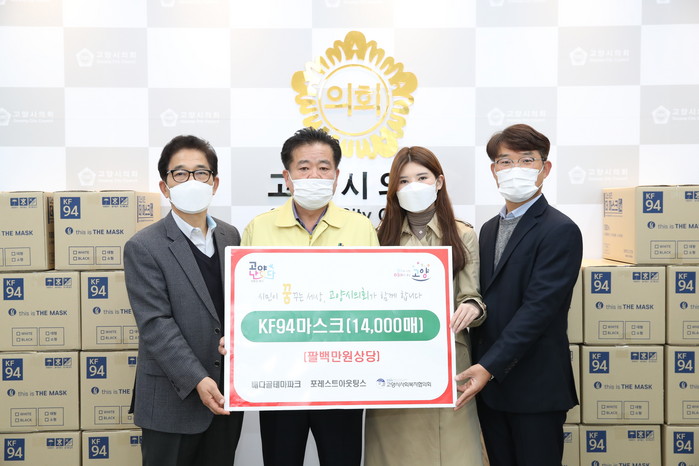[부자동네타임즈 김인수기자] 고양시의회(의장 이길용)는 11월 5일 고양시의회 영상회의실에서 관내 기업인 배다골테마파크(관장 김영수)와 포레스트아웃팅스(대표 현은정)으로부터 1만4천장을 기부 받아 고양시사회복지협의회에 전달하는 사랑의 마스크 전달식을 가졌다.