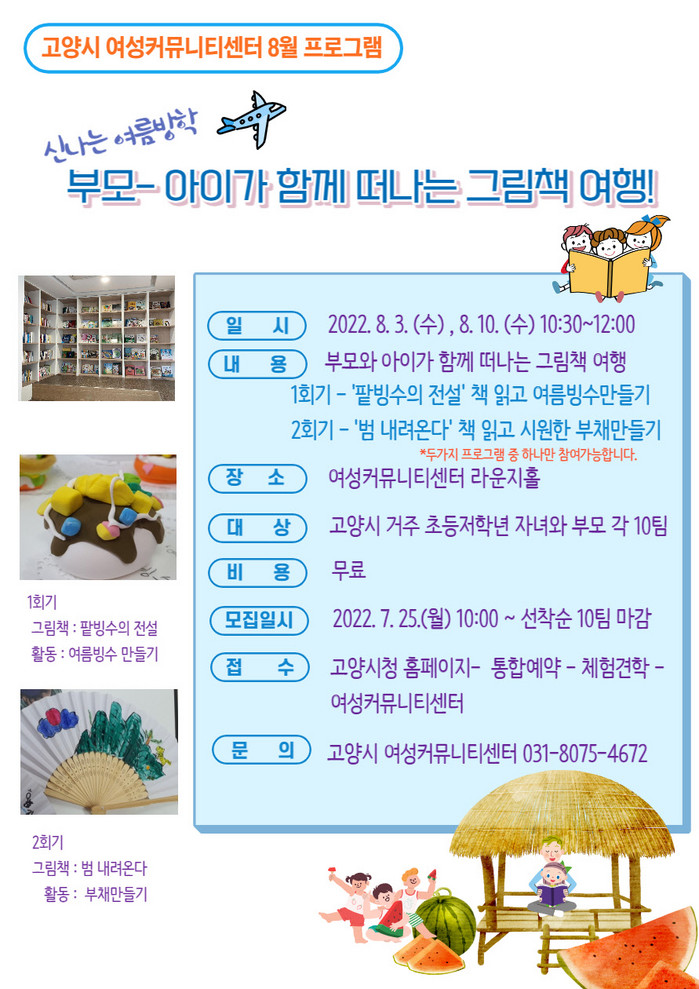 1회기에는 ‘팥빙수의 전설’을 읽고 여름 빙수 만들기, 2회기는 ‘범 내려온다’를 읽고 부채 만들기를 진행한다. 두 가지 프로그램 중 하나만 참여할 수 있으며 자녀와 부모가 함께 참여해야 한다.