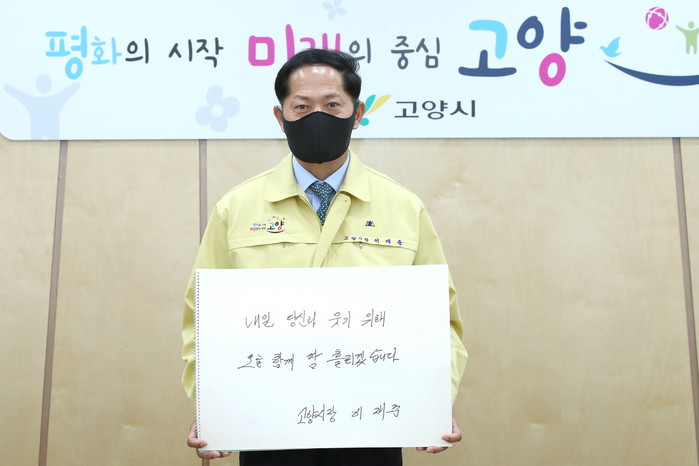 [부자동네타임즈 김인수기자] 이재준 고양시장이 29일 코로나19 극복 응원메시지를 담은 사진을 SNS에 올리며 코로나19 극복 희망캠페인 릴레이에 동참했다.