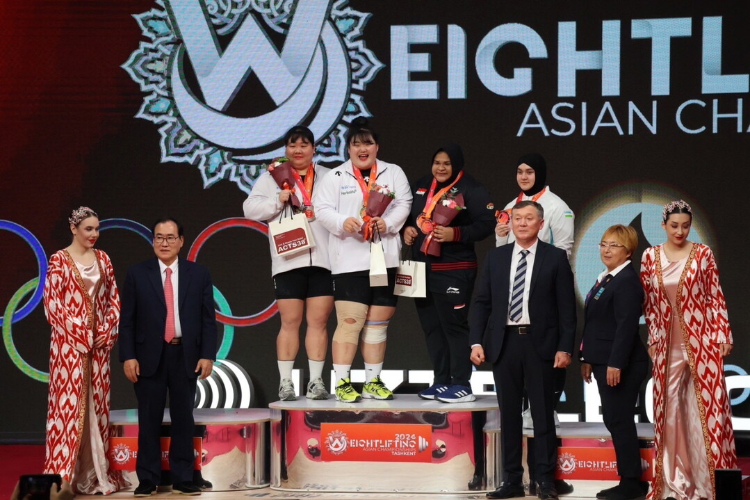 [사진설명] 2024 아시아역도선수권대회 시상식에서 박혜정 선수(단상 가운데)