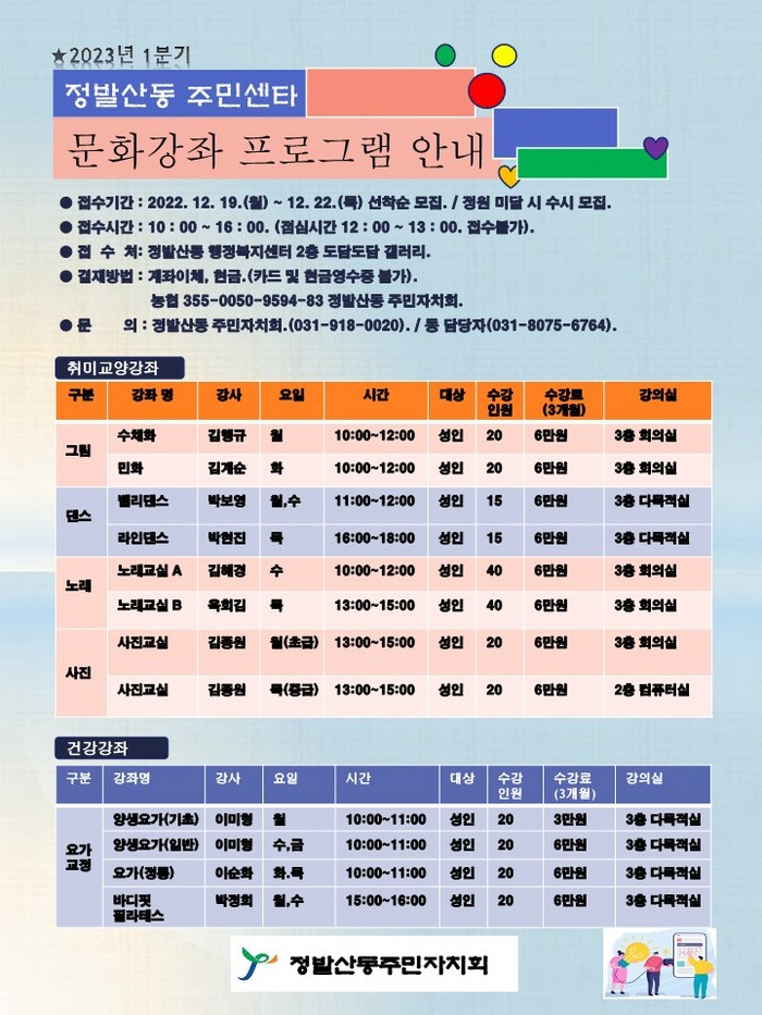 [부자동네타임즈 김인수기자] 고양특례시 일산동구 정발산동 주민자치회(회장 윤만승)는 12월 19일부터 12월 22일까지 2023년 1분기(1월~3월) 문화강좌 수강생을 모집한다고 밝혔다.