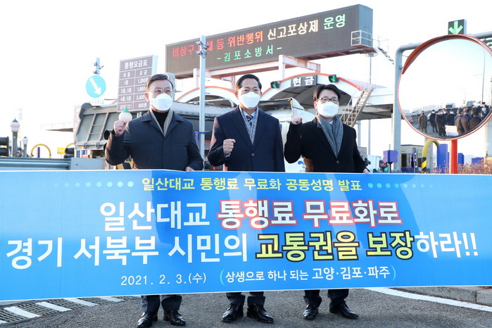 이어 2월 3일 일산대교에서 이재준 고양시장, 정하영 김포시장, 최종환 파주시장이 함께 ‘일산대교 무료화 촉구 공동성명서’를 발표하고 “일산대교가 경기서북권에 다른 선택지가 없다는 점을 이용해 높은 통행료를 징수하며 시민들의 교통권을 침해해 왔다”며 공동행동을 약속하고, 경기도-국민연금공단 간 협상에도 참여를 요청했다.