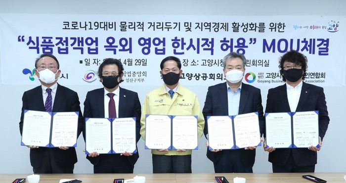 이번 협약은 고양시가 식품접객업소의 옥외 영업을 한시적으로 허용하고 협력기관에서는 업체들에게 옥외 영업의 참여와 영업자 준수사항 이행을 독려해 코로나19 감염 예방을 위한 물리적 거리두기를 실천하고 지역경제를 활성화하고자 마련 됐다.