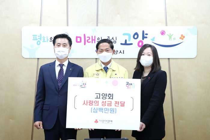 NH농협은행 고양시지부의 성금 2,500만원은 정부긴급재난지원금 카드발급 대금 중 재고수량에 대한 전액 기부금이며, 고양시 기관장들의 모임인 고양회의 성금 300만원은 회원들의 회비로 모아진 것이다.