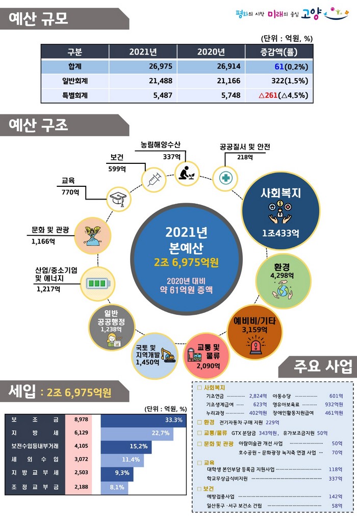 고양시는 코로나19로 경제성장 둔화와 교부세 감소의 어려운 재정 여건에 경상예산을 대폭 삭감하고, 사업구조조정과 신규투자 억제를 통해 재원을 마련해 주민 숙원사업은 최대한 반영하고자 했다. 2021년 주민참여예산은 106억 원으로 역대 최대 규모로 편성했다.
