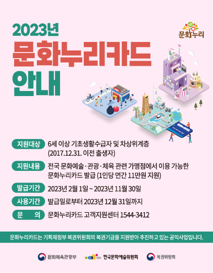 문화누리카드는 문화격차 완화와 삶의 질 향상을 위해 6세 이상 기초생활수급자 및 법정 차상위계층을 대상으로 문화·체육·여행 혜택을 지원(2023년 기준 1인당 연간 11만원)하는 바우처 카드이다.