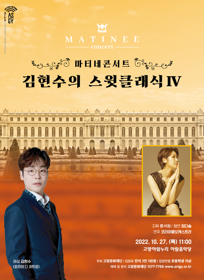 [부자동네타임즈 김인수기자] 고양문화재단(대표이사 정재왈)은 오는 10월 27일(목) 오전 11시, 2022년 아람누리 마티네 콘서트 마지막 프로그램으로 <김현수의 스윗클래식Ⅳ>를 고양아람누리 아람음악당에서 선보인다. 평일 오전 대표 클래식 프로그램인 <아람누리 마티네 콘서트>는 시민들을 위한 클래식 입문 공연으로 저렴한 입장료에 수준 높은 클래식 음악을 즐길 수 있어 매년 많은 사랑을 받고 있다.