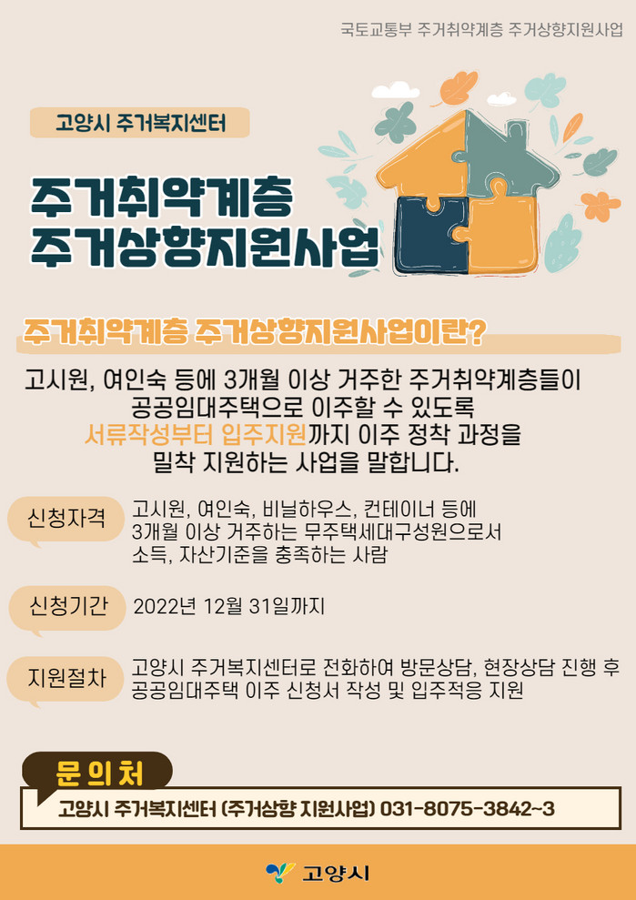 지원 대상은 쪽방, 고시원, 비닐하우스, 컨테이너, 침수우려 지하주택 등 주거 취약지에서 3개월 이상 거주하는 무주택자이다. 자세한 신청방법 등은 고양시 주거복지센터에서 안내받을 수 있다.