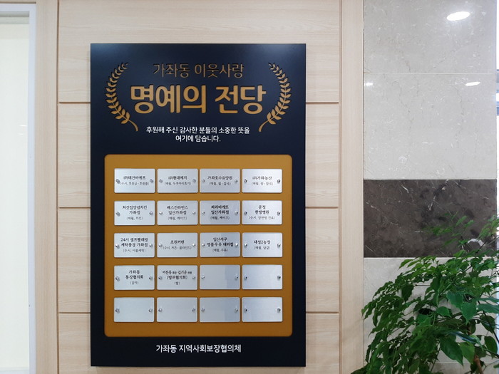 명예의 전당에 새겨 진 후원자는 가좌동 지역사회보장협의체의 특화사업을 후원하는 지역 내 기업, 소상공인 및 개인 기부자들로서 어려운 이웃에 나눔의 소중함을 몸소 실천하는 우리의 이웃들이다.