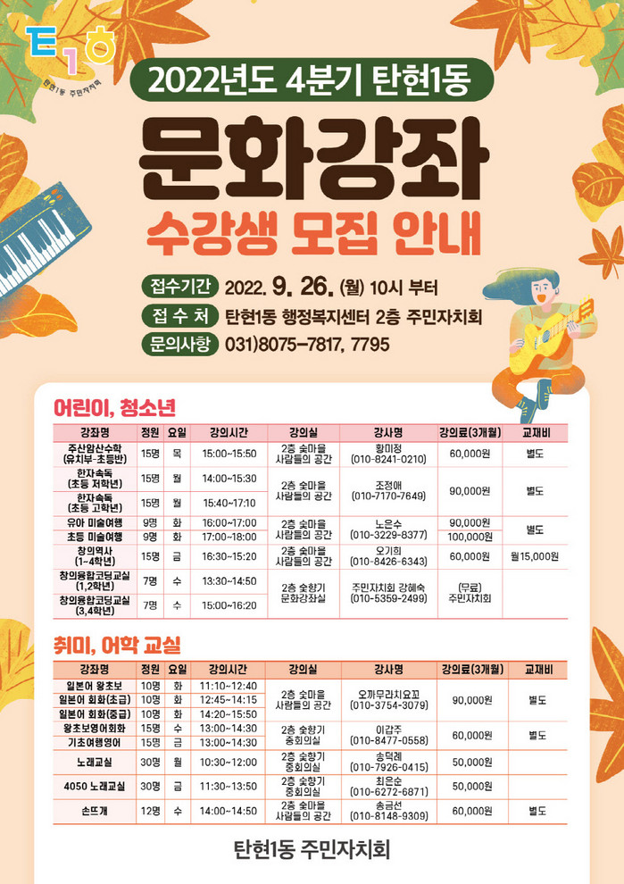기타 모집 안내에 대한 자세한 사항은 탄현1동 행정복지센터(☎031-8075-7795)또는 주민자치회(☎031-8075-7817)로 문의하면 된다.