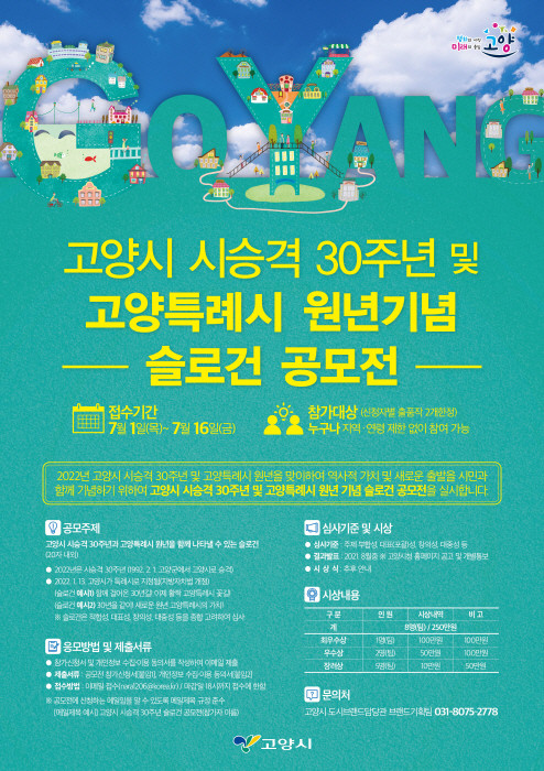 공모 주제는 ‘고양시 시승격 30주년과 특례시 원년을 함께 나타낼 수 있는 슬로건’이다. 지역·연령에 상관없이 누구나 참여 가능하며, 접수 기간은 오는 7월 1일부터 16일까지다.(마감일 18시까지 접수분에 한함)